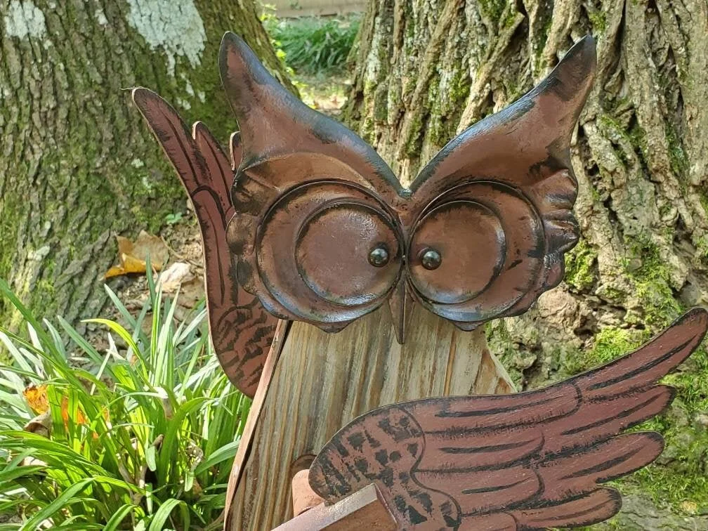 This brown Owl whirligig features an iron head and legs. The metal head is affixed to a wooden body constructed from distressed barnwood. The owl's wings rotate, one side clockwise and the other side counterclockwise.