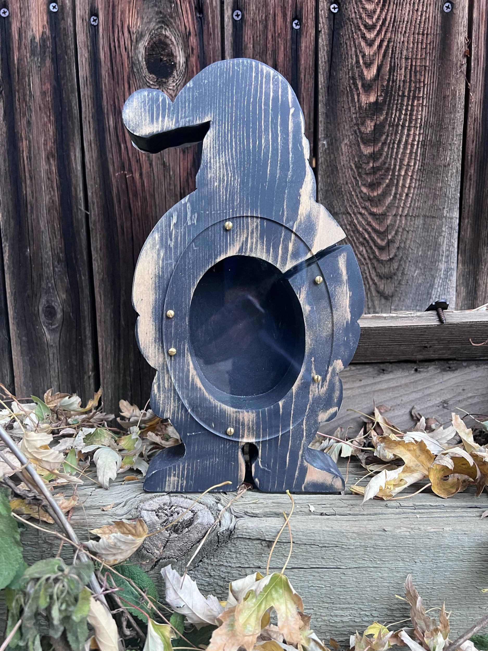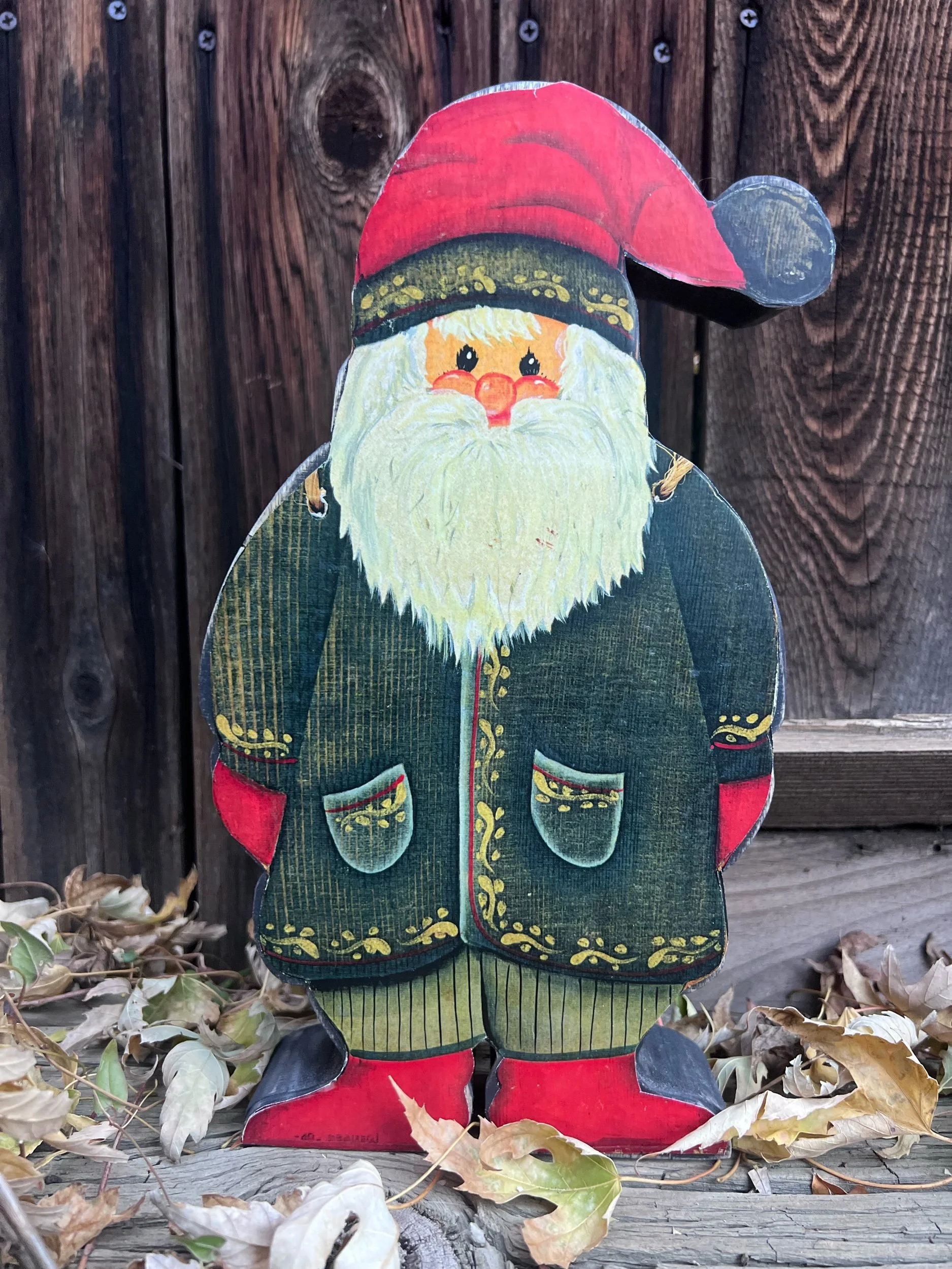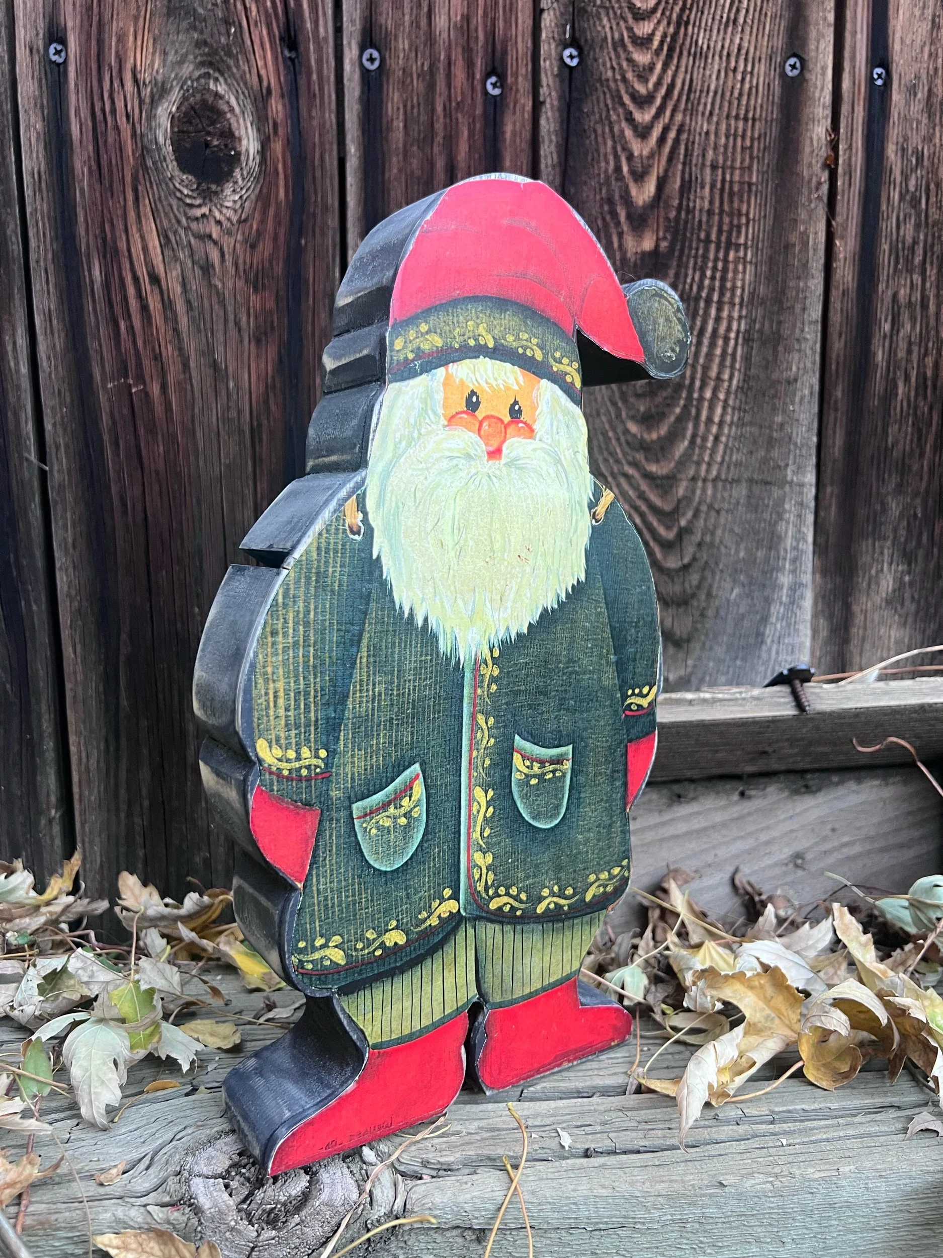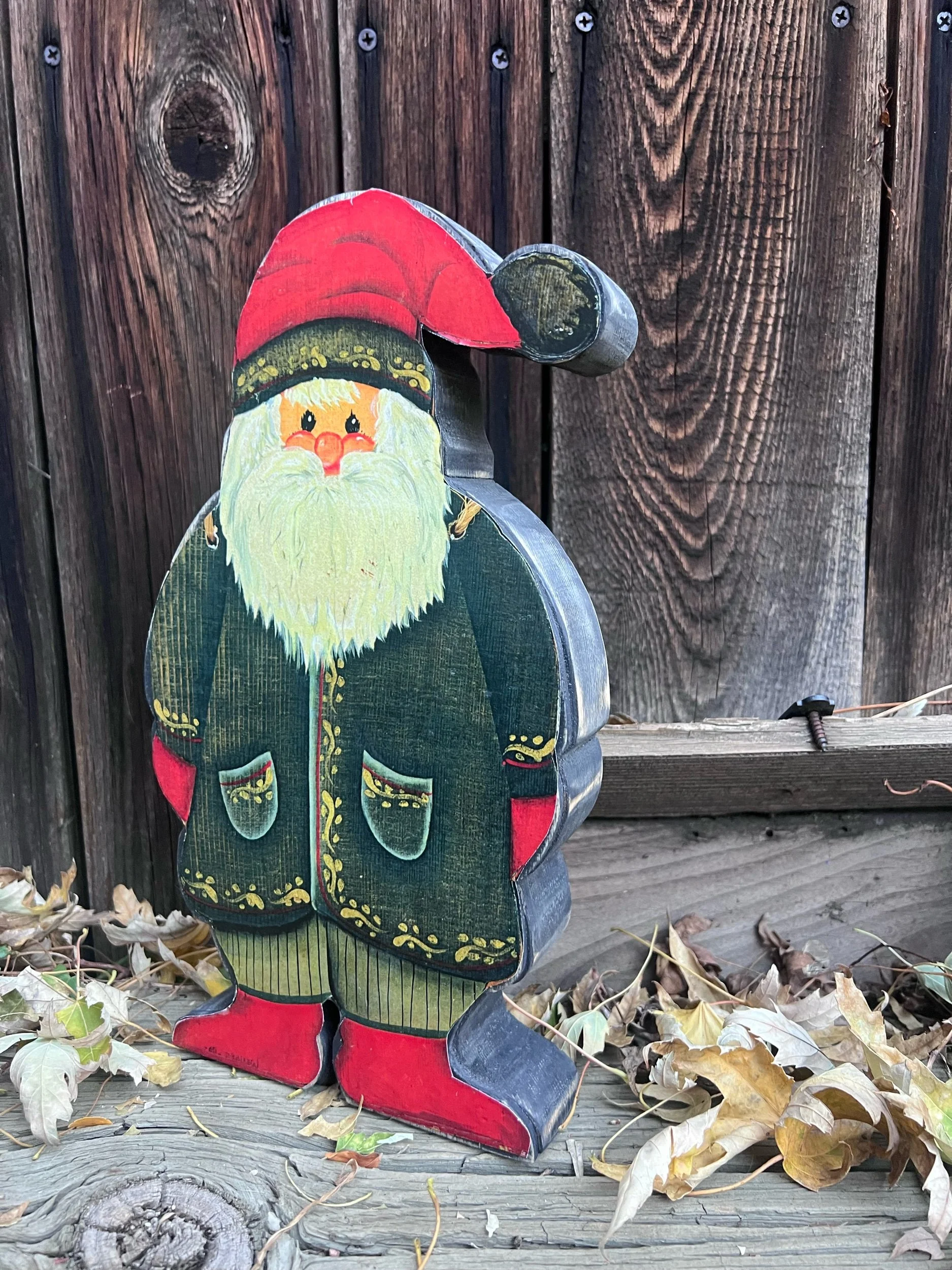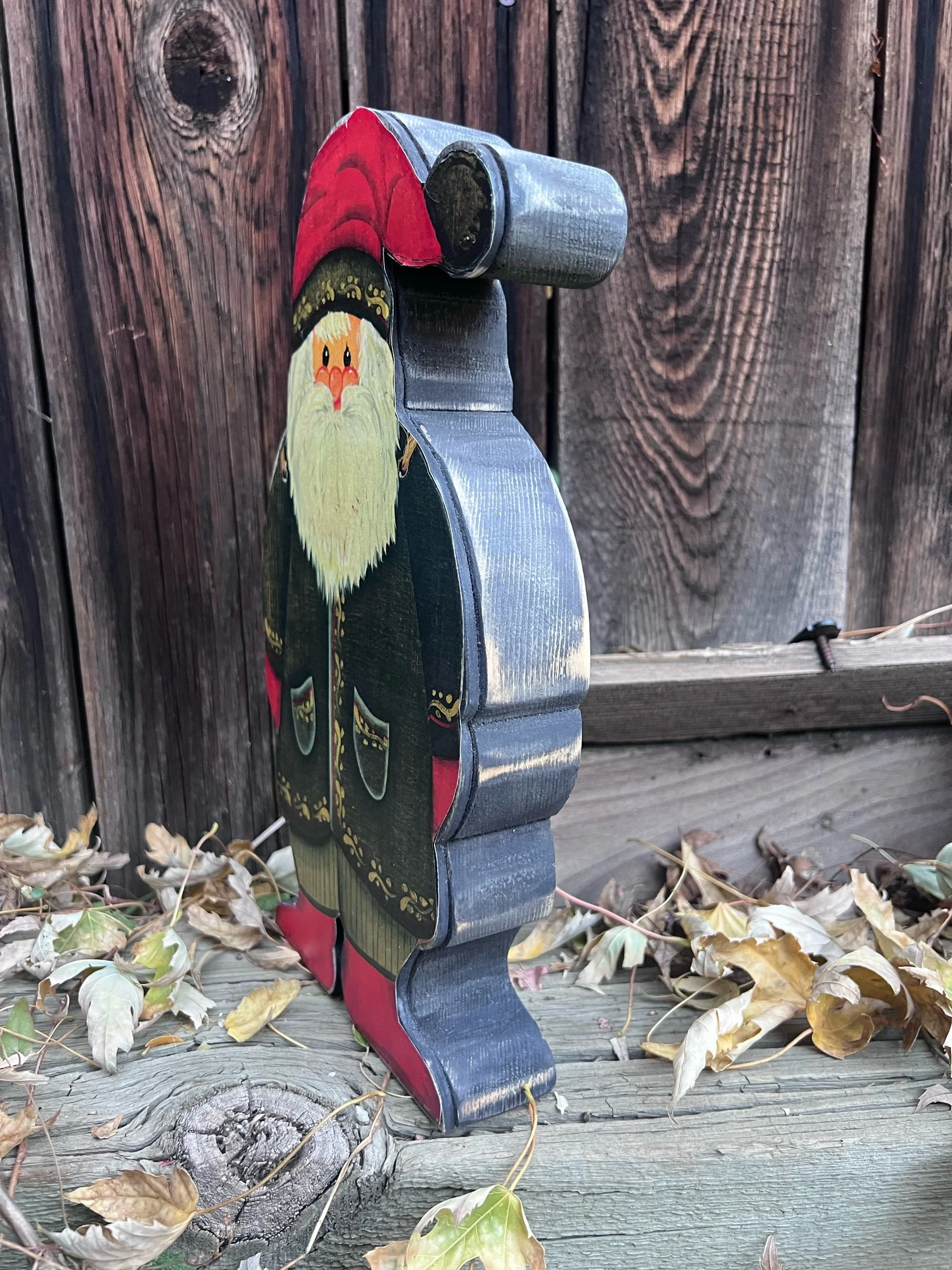 Santa is a coin bank cut from wood, painted, and distressed to give the bank an aged look. A paper cut-out of Santa was glued to the wood. Santa measures 11.25 x 6.25 x 1.25. No one knows he is a bank, unless he is turned around.He has a slot to insert coins. There is an acrylic panel on the backside. You can watch your holiday savings grow. Removing your money is an easy as removing the brass screws and acrylic panel. Great gift for children and adults alike.